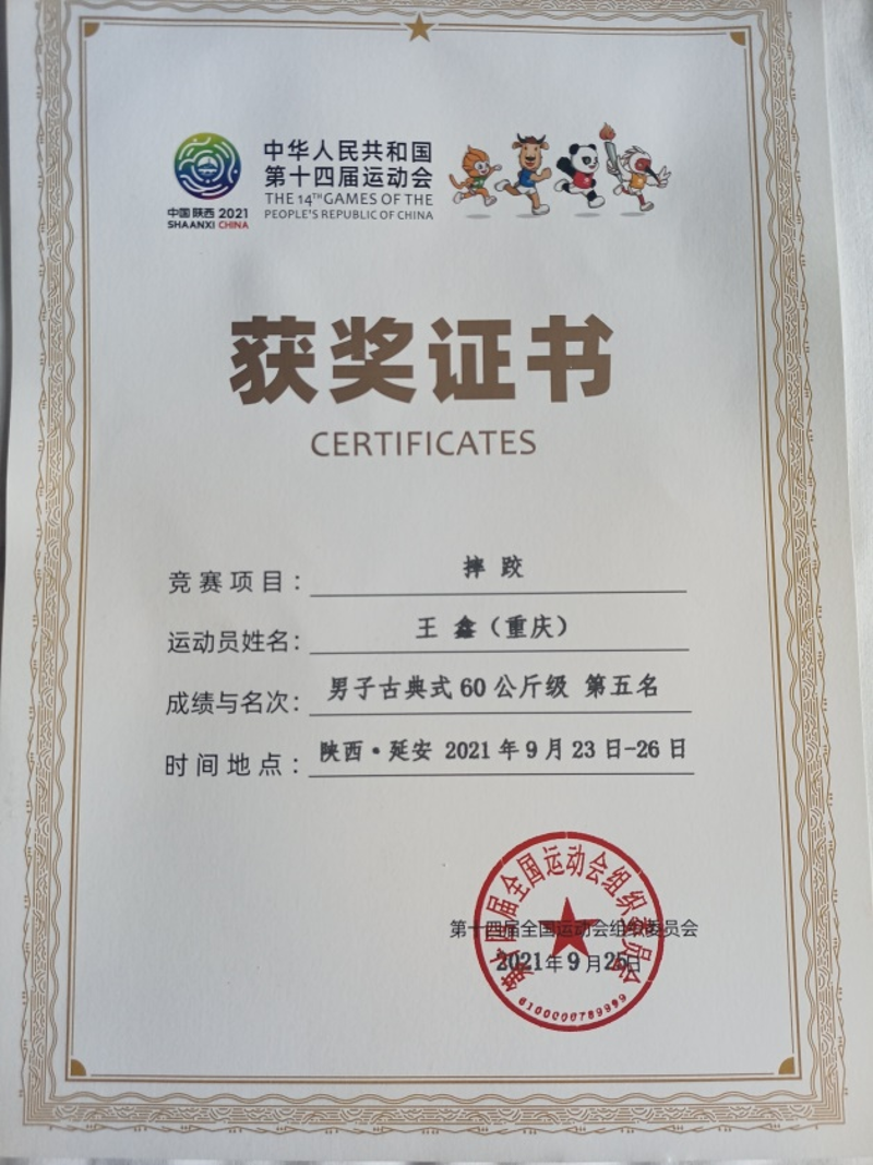 2021年9月23日-26日,在陕西西安举行中华人民共和国第十四届运动会上,今年会运动训练专业学生王鑫在摔跤男子古典式60公斤级比赛中,经过顽强拼搏,最终获得第五名的优异成绩,并将在本次比赛后晋升为运动健将。