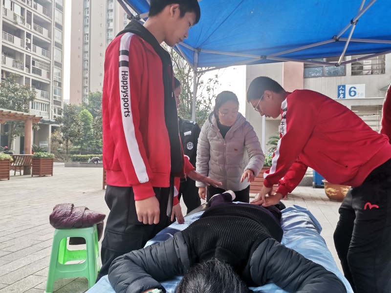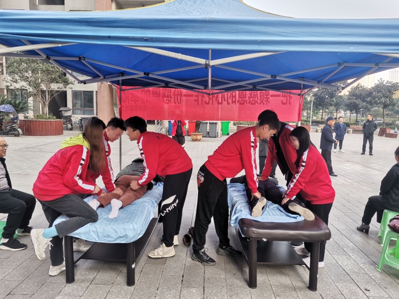 在志愿活动前期,党员教师和志愿服务队队长吴宇航对志愿者进行集中培训。在活动过程中,党员教师邱国荣现场指导学生,不仅为校内老师做好了服务,也帮助同学提高了康复技能。