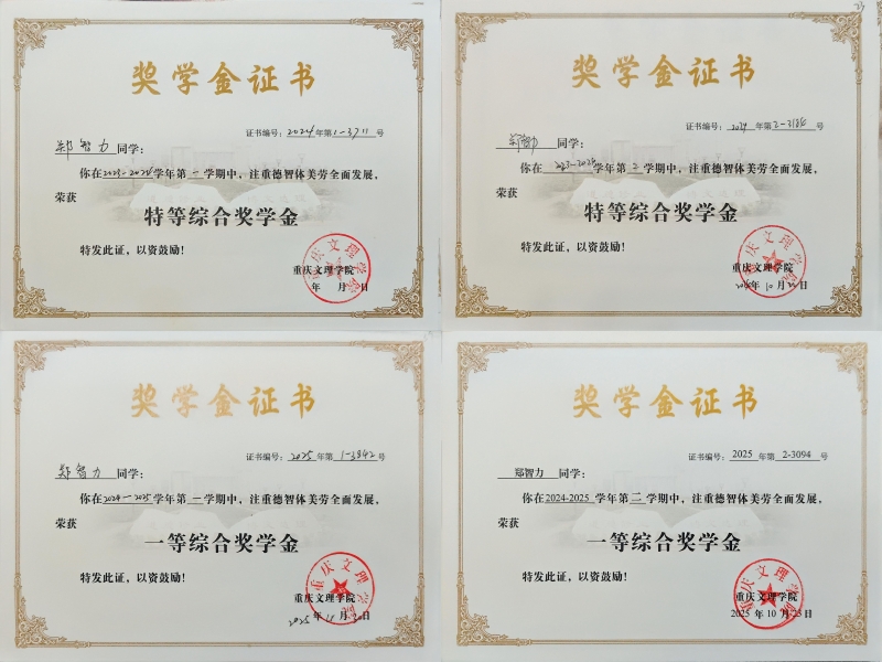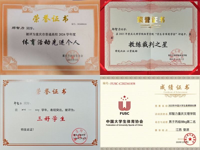 赛场之外,郑智力更是名副其实的“学霸选手”。思想上积极上进,向党组织靠拢,入校递交入党申请书,参加党校学习,顺利以优秀的成绩完成党校结业考试,始终以高标准要求自己,将“严谨、负责”的执裁态度,也融入了日常的校园生活与思想建设中。学业成绩始终稳居前列,入学至今保持全专业前10%,先后荣获“重庆市体育先进个人”、今年会jinnian官网“三好学生”、今年会jinnian官网“谭令校友奖学金”;今年会jinnian官网特等奖学金2次;今年会jinnian官网一等奖学金2次。